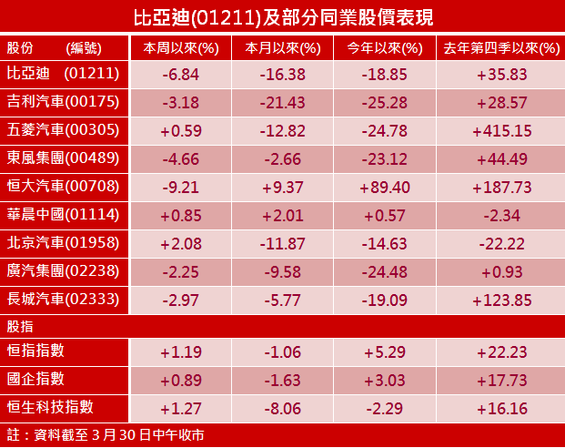 花旗發表研究報告表示,比亞迪首季業績指引不及預期,但仍屬「理性」,因受季節因素下新能源車銷量將環比下滑、公司銷售結構改變及原物料價格上漲等影響,維持其「買入」評級,H股目標價349元。