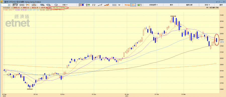 港股經過1月至2月下旬急升,3月份開始試底,恒指初現下降軌,結束自去年10月以來的五個月連升,低見27505點,重返去年二月疫情初期的位置。投資者繼續關注經濟復甦與通脹風險,美國10年期國債孳息率一度高見1.776厘。新經濟及高估值股份持續捱沽,舊經濟跑出。
