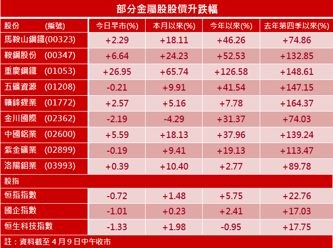 發出盈利預告後,金屬股隨即落鑊,其中中鋁表現亮眼,開彈一成一舉突破20天線(約3.61元),惟盤中升幅收窄,半日收報3.78元升5.59%。重鋼半日更飆高二成七報1.79元。江銅報16.58元微升0.36%。