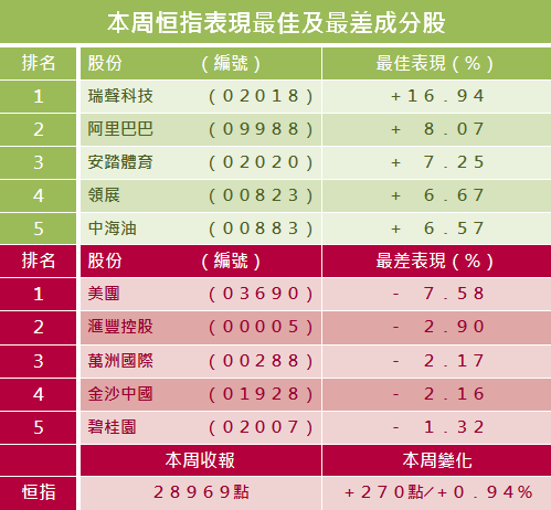 小米(01810)公布多項消息,除了發售首款摺疊機之外,更開展電動車業務,以及旗下「紅米」與騰訊遊戲合作,股價走勢強勁,小米(01810)本周升1.36%,報26.05元;瑞聲(02018)業績造好發盈喜,本周升16.94%,報46.6元,是恒指表現最佳;舜宇(02382)升3.87%,報185元;鴻騰(06088)本周升0.8%,報2.51元。
