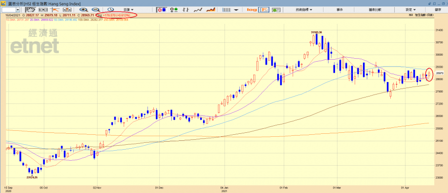 內地今日公布首季GDP,按年升18.3%,略遜市場預期,港股今早表現靠穩,隨後升幅一路擴大,曾挑戰二萬九關口,但仍未能企穩,恒指報28969,升176點或升0.61%,主板成交1431.73億元。