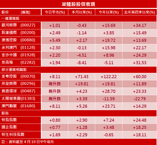 澳門旅遊局公布上周五(16日)錄得約3﹒4萬名旅客人次入境,是自疫情以來單日旅客最高。市場憧憬澳門旅遊業逐步復甦,加上憧憬五一黃金周,多隻濠賭股再創新高,當中永利澳門(01128)於年初至今升幅高達16%、銀娛(00027)升幅逾15%,跑嬴恒指。招銀國際策略師蘇沛豐對《經濟通通訊社》表示,賭股等復甦概念股,適宜於中短期部署。
