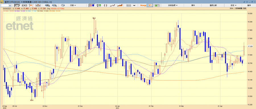 市場憧憬本地餐飲股盈利復甦。申萬宏源投資顧問部主管麥嘉嘉對《經濟通通訊社》表示,大家樂是次盈喜主因低基數效應,加上房委會與房協等業主提供臨時租金寬免,其能否將低廉租金及外賣業務增長繼續維持仍為未知之數,本季及來季溢利表現或未如首季良好,籲無貨者不必追貨,有貨且低位買入者可短期內套現鎖定利潤,在16.7元支持位與17.8元阻力位間區間操作。