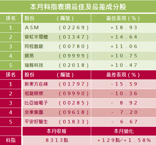 總結大市4月份走勢,恒指累升346點或1﹒2%,最高見29405點,最低見28274點,本月收報28724點。國指整個4月份在11281點至10792點之間波動,最終收報10825點,全月跌146點或1﹒3%。科指則在8669點至8018點之間上落,收報8313點,升129點或1﹒6%。