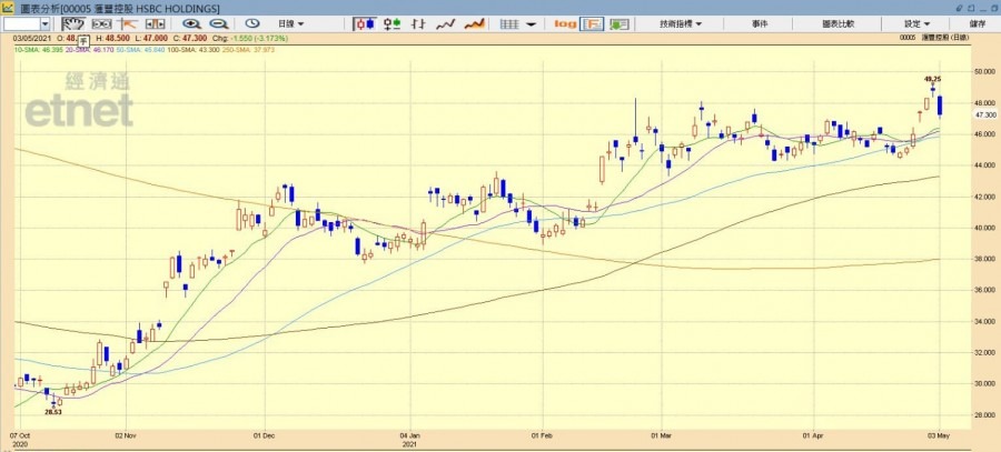 匯控高位回吐近3.2%,報47.3元。(經濟通HV2系統截圖)