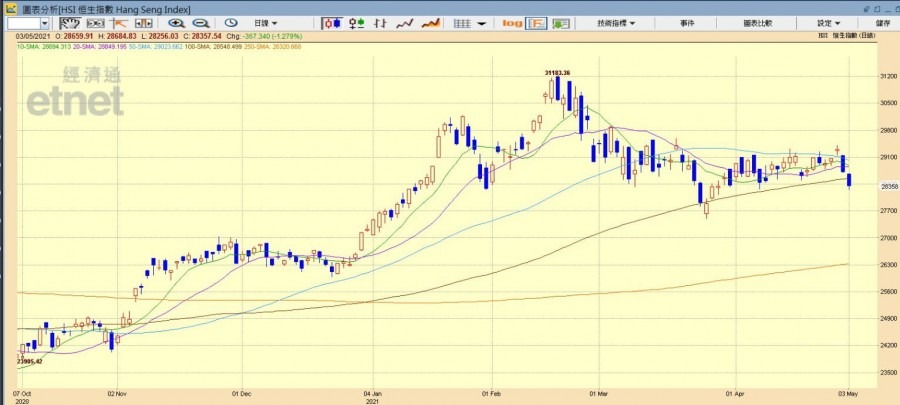 美國經濟數據再次引起市場對通脹的憂慮,市場聲音建議開始「收水」,加上大型藍籌公布季績後有資金鎖定利潤,拖累美股上周五(30日)低收。港股今日為五月首個交易低開64點報28659點。近日網信辦通報騰訊(00700)、百度(09888)等地圖APP違法收集個人信息,科技股繼續走弱,加上金融重磅股如匯控(00005)、平保(02318)、友邦(01299)、建行(00939)走低,大幅拖低港股。再者,港股通因內地假期關係暫停,缺乏北水下,令大市成交持續淡靜,港股最多曾跌468點見28256點,失守百天線(約28548點)。臨近收市美期抽高帶動港股跌幅稍微收窄。最終港股全日收報28357點,跌367點或跌1.28%,主板成交958.46億元跌近24%。國企指數報10713點,跌112點或跌1.04%。恆生科技指數報8227點,跌85點或跌1.03%。