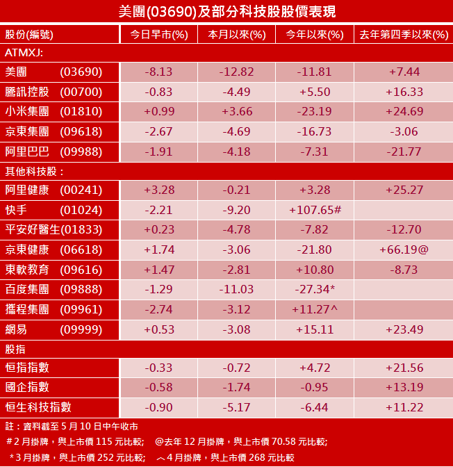 科技股投資氣氛,亦受累於內地官方政策。市場監管總局上周五(7日)召開互聯網平台企業整改督查專題會,對互聯網平台企業整改督查和評估工作進行調度。會議指出,各相關省(市)市場監管局要充分認識平台企業整改督查工作的重要意義,立即對34家平台企業開展中期督導,全面檢查平台企業落實4月13日行政指導會整改要求情況,並對整改效果進行評估。