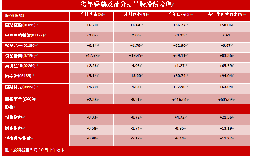 復星醫藥半日急升17.78%報58.95元,暫連升而兩日累升22.05%;國藥(01099)半日升6.2%收25.7元;中生製藥(01177)升3%,報8.2元;康希諾(06185)升5.14%,報319元。