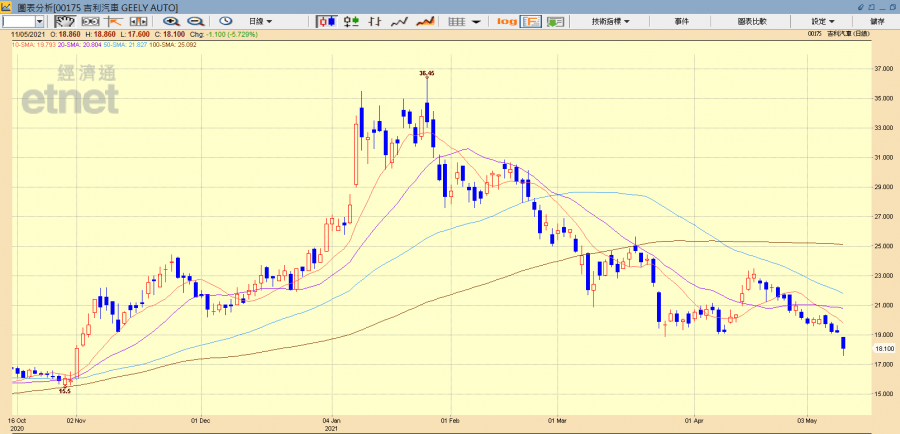 除Tesla因素外,吉利早市急跌見半年低位,還主要是銷量數據欠佳影響。吉利公布今年4月份總銷量約10.03萬部,按年減少5%,與3月水平大致相若。當中,3787部為新能源和電氣化汽車。集團於4月之出口量按年增長約96%至8578部。集團月內於中國市場之總銷量為91753部,按年減少9%。今年首4個月,集團總銷量43.39萬部,按年增長39%,達集團2021年全年銷量目標153萬部之28%。