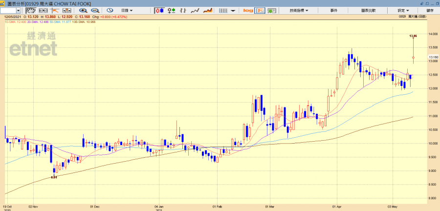 周大福今日(12日)早市曾見13.86元上市新高(經濟通HV2系統截圖)