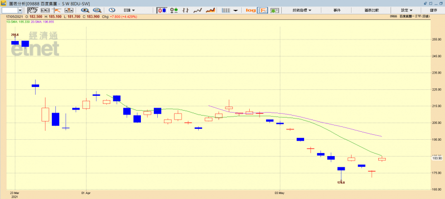 安里主席兼行政總裁黃偉康則向《經濟通通訊社》表示,百度並非處於反壟斷事件的風眼,且現價較高位回落近四成,其他科技股亦有反彈跡象,百度現價已可撈底,短線阻力位200元,主要受惠索羅斯旗下基金公司吸納消息刺激。