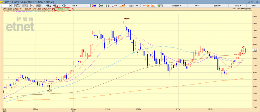 舜宇(02382)跌0.05%,報197.4元。(經濟通HV2系統截圖)