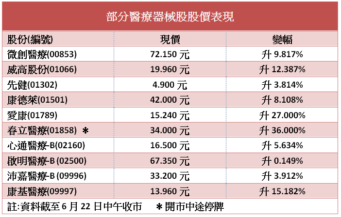 港股今早(22日)載浮載沉,投資者炒股不炒市,內地醫療器械板塊大幅炒高備受觸目。國家醫保局等八部門發布《關於開展國家組織高值醫用耗材集中帶量採購和使用的指導意見》要求,實施人工關節集中帶量採購。天風證券認為,此次關節集採相比支架方案入圍規則溫和,避免價格倒掛,該行認為如最終中標結果可接受,相關公司有望迎來投資機會。春立醫療(01858)急升36%後停牌未公布原因,威高股份(01066)半日升12.8%逼近20元關,愛康(01789)更飊27%。關節醫器股大幅受捧,心臟及血管相關的醫器股一舉炒起,沛嘉醫療-B(09996)、先健(01302)、心通醫療-B(02160)分別升4%至6%。整體市場對醫器股看高一線,或支持今日公開招股的歸創通橋-B(02190)的認購反應。
