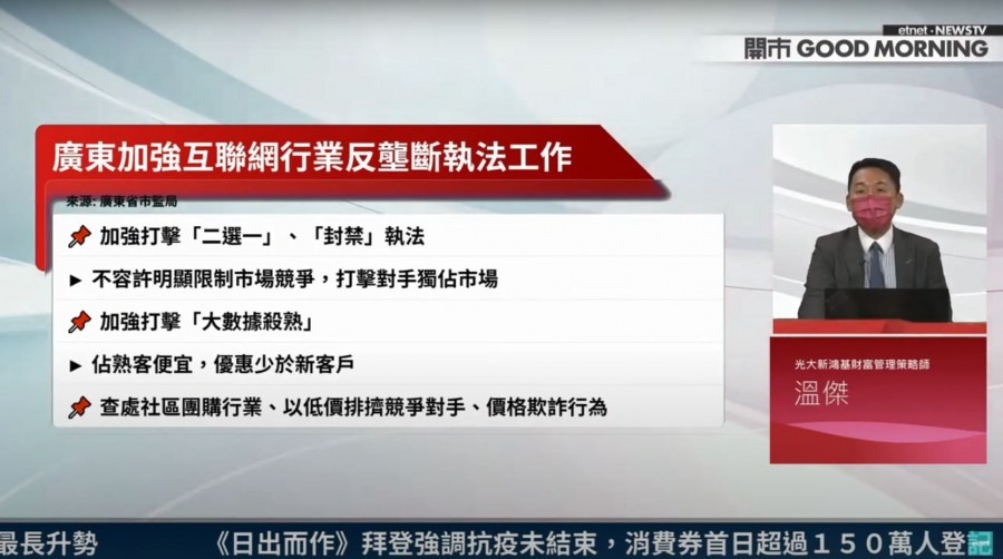 廣東加強互聯網行業反壟斷執法工作 ,對大型互聯網平台加大限制「二選一」、「封禁」及「大數據殺熱」等行為。(《開市Good Morning》截圖)