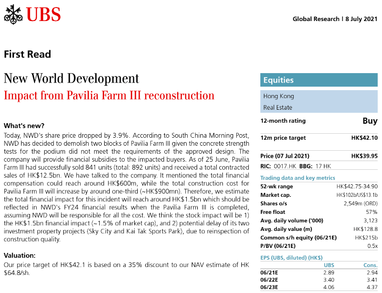 瑞銀發表研究報告表示,該行與公司就事件進行過討論,對方提到整體的經濟賠償或達到約6億元,而柏傲莊III的總建築成本將增加約三分之一,即大約9億元。因此該行估計今次事件的總財務影響將達約15億元。該行維持新世界目標價42.1元,以及「買入」評級。