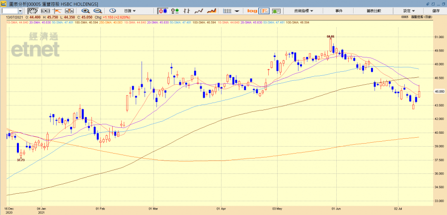 匯控去年4月初公布接獲英倫銀行通知,要求取消派發2019 年第四次股息0.21 美元,股價應聲下跌,及至9月下旬跌穿2009年的28元「世紀供股價」。至今年2月下旬,匯控公布截至去年12月底止年度列帳基準稅前盈利近88億美元下跌逾34%,但仍勝市場預期,經考慮英國審慎監管局上年11月允許銀行機構重啟派息和回購,董事會向股東作出分派的臨時方針,恢復派股息每股15美仙,雖然較以往的第四次股息21仙為少,但投資者受落,股價節節回升至48元水平以上,於今年5月更升至50.85元高位。