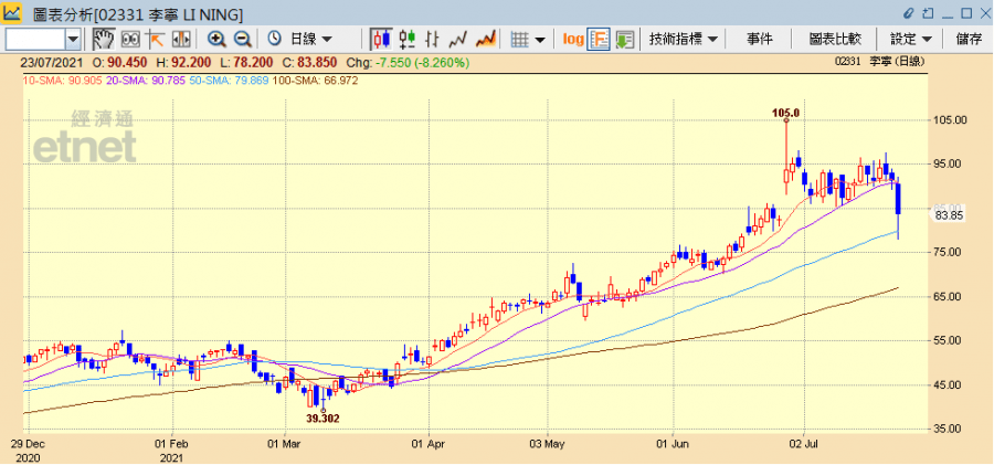 李寧發盈喜後股價曾升至105元,今日卻曾跌穿80元。(經濟通HV2系統截圖)