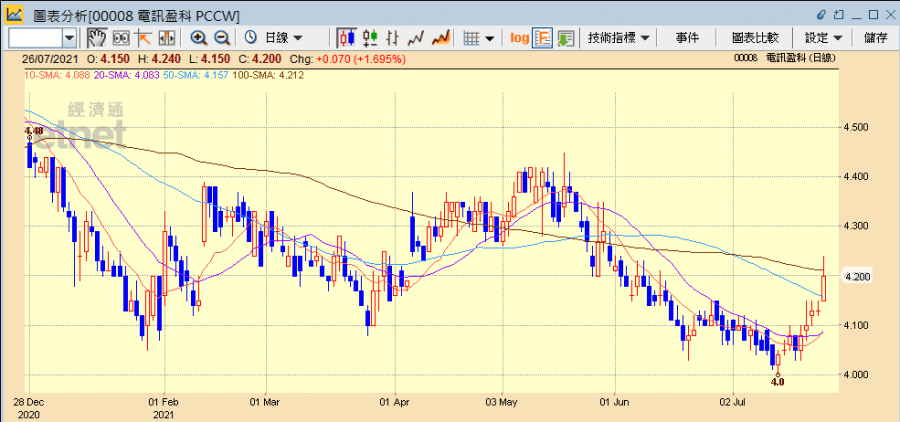 今日(26日)大市愈跌愈多,臨近收市更跌逾千點,想找逆市向上的股份實在不容易,其中電訊盈科(00008)公布出售數據中心業務,涉58.5億港元,為集團帶來逾14億港元收益,刺激股價曾升逾2%,全日仍收報4.20元,升1.7%,可謂跌市奇葩。