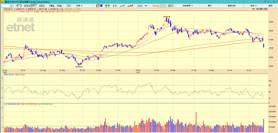 恒指今日大跌,相信主要是投資者對科網股及中資教育股負面消息繼續發酵的憂慮影響,港股今早開市以裂口跌穿250日線(俗稱牛熊分界線),氣氛已極度悲觀,其後恒指反覆下跌,午後跌勢未止,最終跌逾千點收市。安里主席兼行政總裁黃偉康向《經濟通通訊社》表示,港股上周受美股升勢以及人行放水的消息帶動微升,然而市場突出負面消息再致市場氣氛轉差。