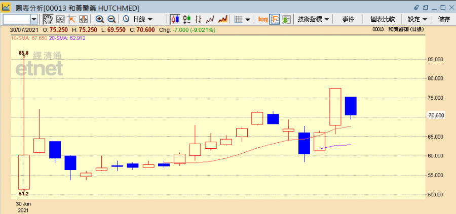 中期業績公布後,市場看來對和黃醫藥藥物銷售表現和上市進度滿意,繼前日炒業績預期而急升9%收報66元,昨日在業績公布後再飆升17.6%收報77.6元,兩日累升逾兩成,不過今日回吐9.2%收報70.6元。