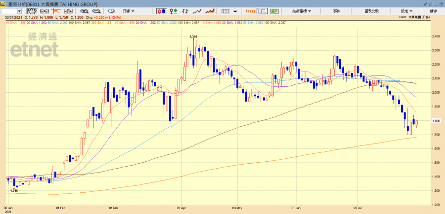 太興集團今年上半年股價表現不俗,但於4月初創出年內新高2.386元後就輾轉下跌,目前股價跌近250天線的水平有較大支持。太興集團的店舖多數設於商場內,顧客的消費力較高。取得消費券的香港市民應該樂於在這類中價食肆增加消費。建議投資者在1.7元的水平開始吸納,靜候中期業績佳音。