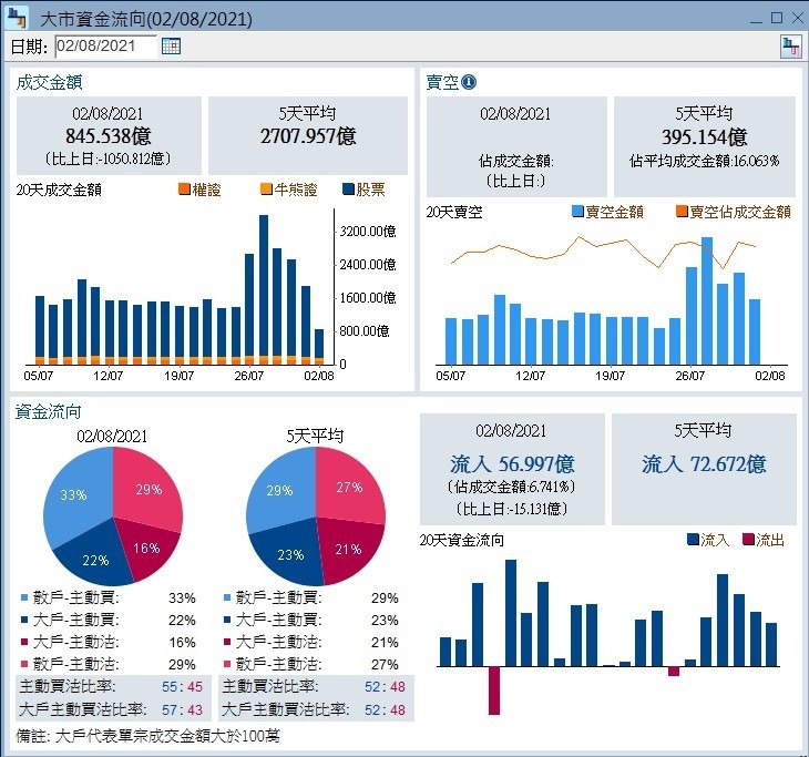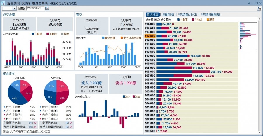 雖然這些並非新鮮事,仍能吸引資金追入港交所。截至周一上午11時20分,據《經濟通HV2報價系統》,港交所獲2.96億元資金淨主動買入,為現貨主板市場上,資金淨主動買入第四大個股。主動買沽比率達61:39,意味配合股價升勢;非散戶、即單宗交易成交金額達100萬或以上的主動買沽比率更達66:34,反映非散戶更積極入市,屬利好現象。不論資金掃貨規模或兩個比率,均較過去五個交易日的平均數理想。