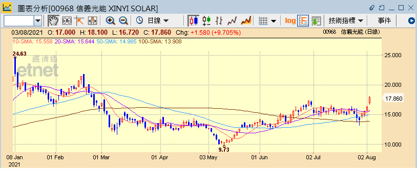 信義光能同樣純利倍增,加上派息亦倍增,刺激股價半日急升9.7%至17.86元,已連升四日,同樣累升逾20%。大行亦紛調高其目標價。其中花旗將其評級由中性上調至買入,預計光伏玻璃的售價已經接近底部,下跌空間有限,而多晶硅和模組設備等原物料成本將更可承受。花旗指,得益於銷售的量價齊升,將公司2021至2023年的淨利潤預測分別上調5%、23%及51%,上調目標價74%至20元,又指給予光伏產業以高估值,因其發展迅速而監管風險低,信義光能2022年市淨率為4.6倍,在中國內地太陽能設備行業領導者中處於低位,為行業首選。中信里昂則指,信義光能業績符預期,上游成本下降,需求持續回升,將有利光伏玻璃價格反彈,長遠增長將繼續受惠於「碳中和」概念,重申其買入評級,但目標價由20元下調至19.5元。另瑞信予其跑贏大市評級,目標價由19元調升至20元;交銀國際予買入評級,目標價由15.74元調升至18.88元,中銀國際予持有評級,目標價由14元調升至16元;高盛維持買入評級,目標價由20.5元調升至23元。