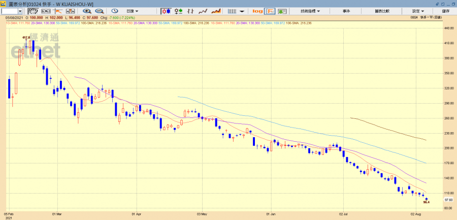 快手掛牌半年來,由歷史高位417.8元計累跌77%。(經濟通HV2系統截圖)