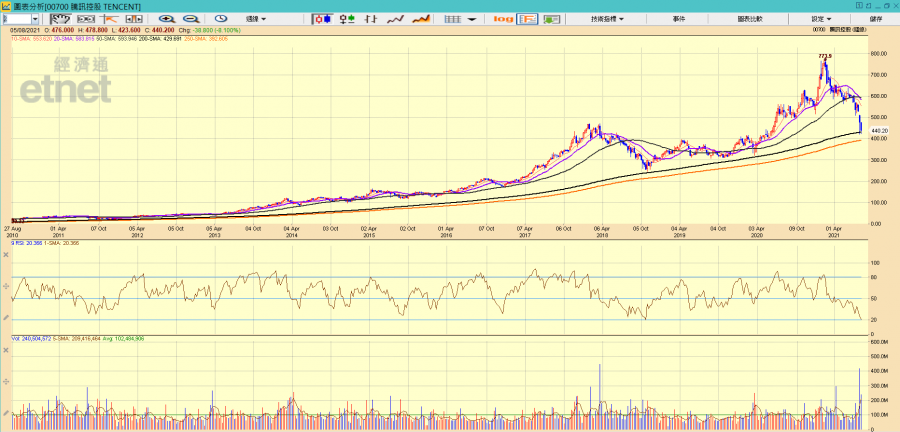 騰訊周線圖股價走勢。(經濟通HV2系統截圖)