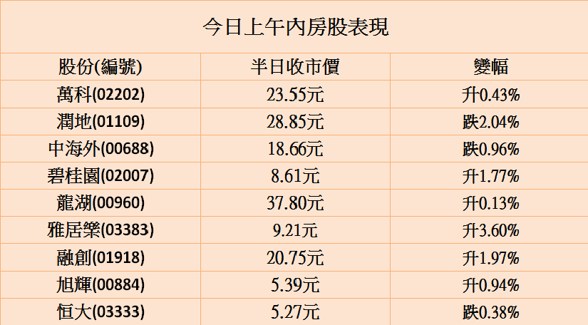 總括而言,預計下半年房地產調控政策繼續從嚴,全國更多城市也將出台二手房指導價政策,預期未來幾個月全國房地產市場整體下跌壓力增大,二手住宅價格環比漲幅下半年進一步走弱,投資者對內房股不宜有太大憧憬,今日(18日)上午內房股股價也只是個別發展(見下表)。