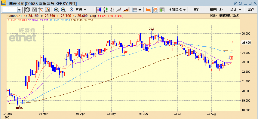 嘉里建設今日逆市升6%收報25.6元,嘉里物流收市則升0.41%報24.3元。