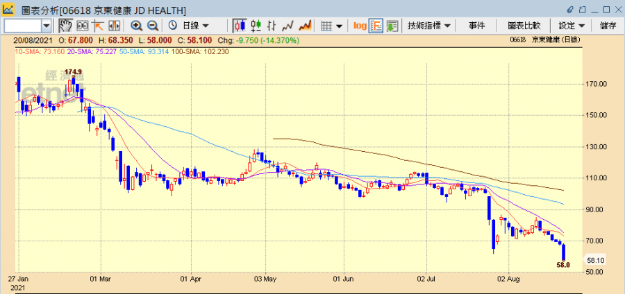 京東健康今日再跌14.37%報58.10元。(經濟通HV2系統截圖)