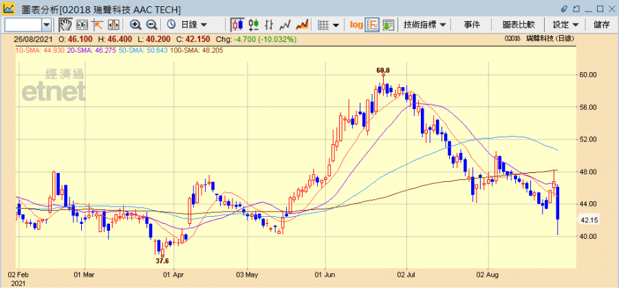 瑞聲科技(02018)昨(25日)中午公布中期業績,純利按年升近1.9倍,股價昨曾升逾半成,收市仍升2.52%,惟看仔細些,才發現其次季業績不理想,大行於其績後亦紛紛唱淡,多只給予中性評級及調低目標價,致股價今日(26日)急挫一成,最多跌逾14%,為表現最差恒指成分股。集團解釋,晶片持續短缺致工廠產能利用率下降,主要客戶產品價格亦有下降,毛利率因而受壓。