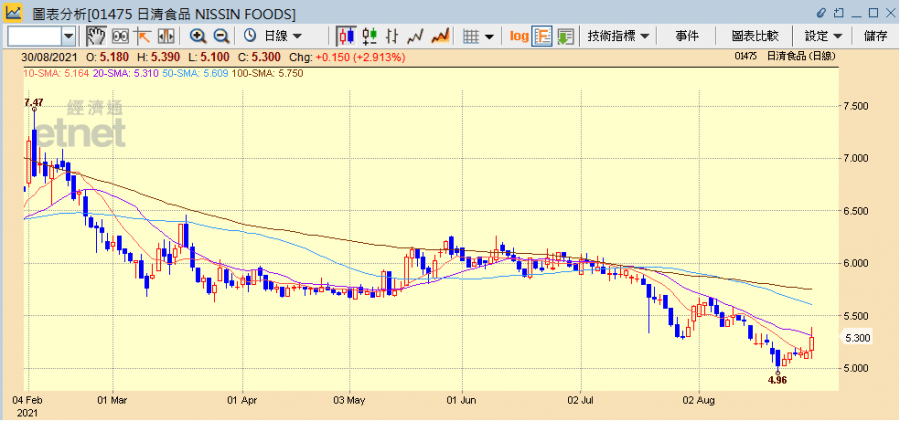 野村於本月初曾發表報告,將日清食品目標價由6.9元降至6.2元,維持「中性」評級,也提到成本壓力上升,以及高基數下的收入增長勢頭減弱,對本財年業績持保守態度,並調降集團2021至23財年盈利預測。日清在香港疫情緩和情況下業績倒退,看來乃在市場預期之內,加上集團願意回購股份亦有助支持股價,今日午後日清曾升逾3%,收市仍漲2.91%報5.30元。