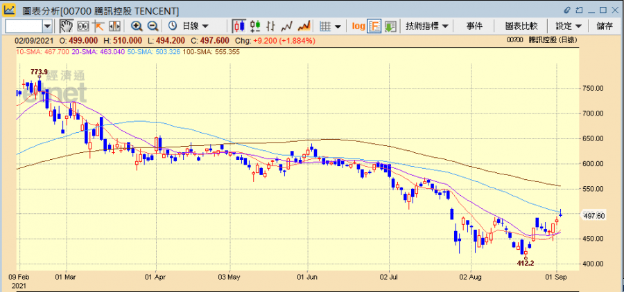 受大陸監管風暴影響,一眾科技股近月飽受壓力,其中「股王」騰訊(00700)股價近乎被腰斬,半年內從高位773.9元下跌至400多元,跌約四成。市盈率亦跌至23倍,位於歷史低點。不過自上月中公布第二季業績後,騰訊(00700)自8月19起連番回購股份,為2019年10月以來首次。雖涉及金額不多,但是總算令股價喘定之餘,更隨整體大市氣氛好轉,出現明顯反彈,股價由8月18日的436.2元反覆升至昨日488.4元,累升逾一成,昨(1日)亦見北水流入跟進,流入近12億元,為北水流入最多股份,今日(2日)股價則一度再飆逾4%高見510元,連升三日,累計升幅近一成。
