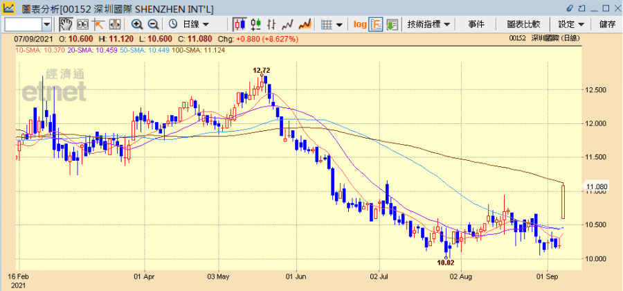 深圳國際現(11:30am)升8.63%報11.08元。(經濟通HV2系統截圖)