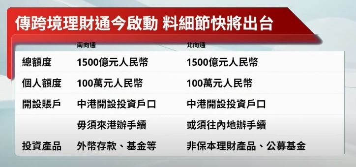 人民銀行廣州分行早於5月發布《粵港澳大灣區「跨境理財通」業務試點實施細則(徵求意見稿)》,南、北向通額度規模暫定1500億元人民幣,個人額度100萬元人民幣。開戶方面,「南向通」投資者毋須來港,只需在內地銀行開立?款和投資帳戶;至於「北向通」,市場最初預期香港投資者仍需親身前往內地開立投資戶口,但由於目前仍未全面恢復通關,港人難以親赴內地開戶,故市場關注「北向通」會否容許投資者在香港銀行開戶。