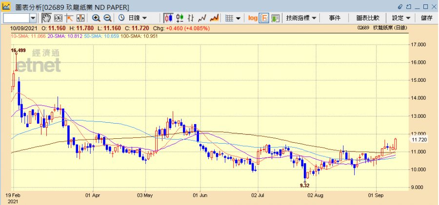 玖龍紙業股價在7月底跌至約9.32元的水平,接近一年來的低位後,目前正以一浪高於一浪的走勢上升,本周股價更創出1個月來的高位11.78元。中國造紙業是傳統製造業,行業集中度不高,行業龍頭暫時看來不會成為加強監管的對象,在新興行業監管加強、相關股份股價受壓之際,資金可能會改為追捧這類具有市場優勢的傳統股份。建議投資者在11.5元的水平買入玖龍紙業,股價在月底前或會重上14至15元的水平。