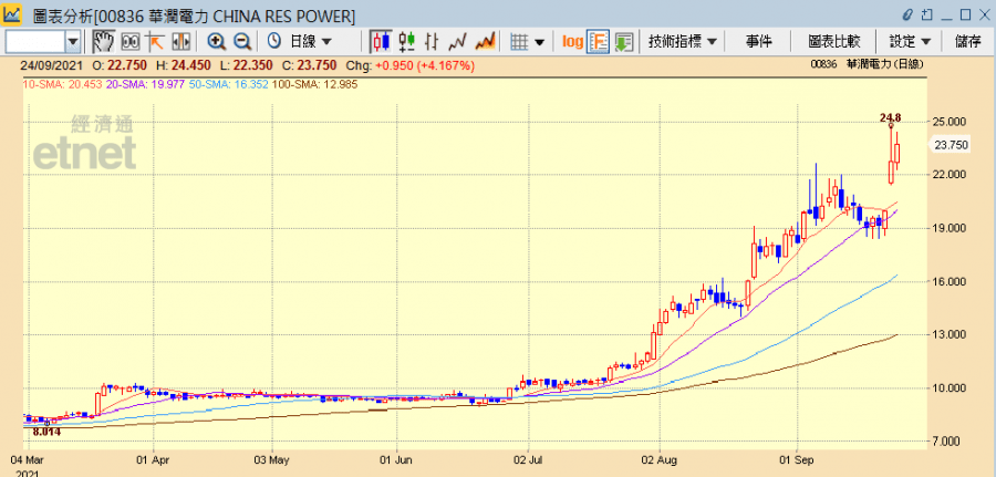 雖然近日大市看來無甚起色,但仍有個別有利好消息的舊經濟股獲資金追捧炒高,其中中資電力股受國家主席習近平提出大力支持綠色能源發展,以及廣東限電等消息刺激,昨日(23日)已普遍飆升一兩成,今日(24日)仍見持續升勢,華潤電力(00836)半日升逾4%,中國電力(02380)更飆升逾8%。值得留意。華潤電力昨為北水淨買入最多港股,淨買入7.72億元,而中國電力也不弱,淨買入2.35億元,排第四位。