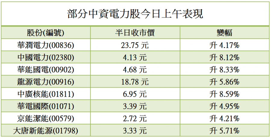 受多項消息刺激,中資電力股今日鑊氣未散,普遍承接昨日升勢,其中潤電半日升4.17%%報23.75元,盤中高見24.45元,連升3日,累升23.83%,成交7.67億元;中國電力則飆升8.12%報4.13元,成交4.75億元,連升5日,累升39.06%,風頭一時無兩。