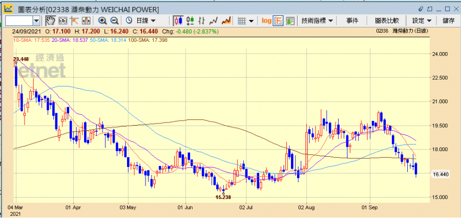 濰柴動力近期股價走勢欠佳,一方面是大市氣氛使然,另一方面是第三季並非行業旺季。濰柴動力股價已調整至多條主要平均線之下,跌近7月中的低位15.438元。預料該公司股價走勢在踏入第四季的旺季會轉好,畢竟該公司業務前景不俗,新能源業務亦惹人憧憬,主營業務受政策打擊的可能性小。建議投資者在16元的水平開始短線吸納。