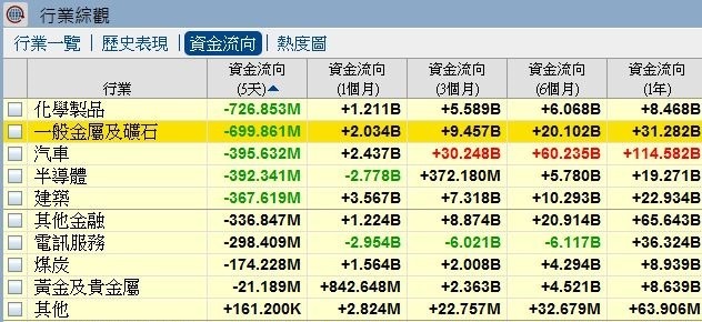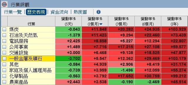 根據《經濟通HV2報價系統》的「行業縱觀」功能,「一般金屬及礦石」業股票,雖然於過去一年、6個月、3個月及1個月均錄得資金淨主動買入,惟過去五個交易日則錄得資金淨主動賣出近7億元,規模為33個行業類別中第二大;再看該板塊同期的變動率,過去五個交易日錄得逾3.7%跌幅,一反過去持續上升的勢頭。