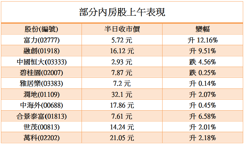 富力和融創今日股價表現明顯好過其他內房股,半日分別急升12.16%及9.51%。不過,內房債務危機看來距解決還遠,現又市傳恒大部分債權人未收到原定派發的債券利息,令恒大系股價今日再度急挫。另方面,內地官媒《經濟日報》發表署名文章稱,中國不能因為個別房企和個別城市房地產市場出現一些新情況,就輕言放鬆調控。看來債務問題和樓市調控仍將持續困擾內地房企。