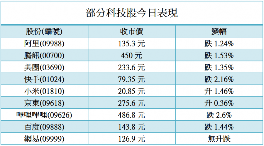恒指今日曾跌逾300點,科指亦曾急挫,但其後收復大部分失地,只微跌0.31%收報5955點,惟阿里收市仍跌逾1%,連跌4日,累計跌幅10.34%,成交40.83億元。騰訊(00700)亦連跌4日,累計跌幅4.21%;美團(03690)同樣連跌4日,累計跌幅7.23%。