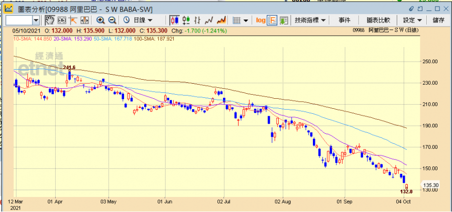 阿里巴巴今日曾跌至132元,創上市新低。(經濟通H2系統截圖)