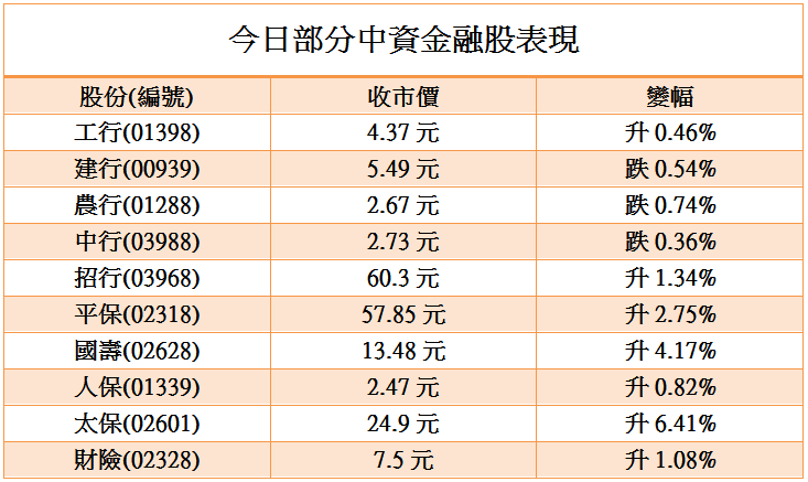 受人行可能降準的市場分析刺激,中資金融股今日普遍造好,其中以保險股表現較佳。
