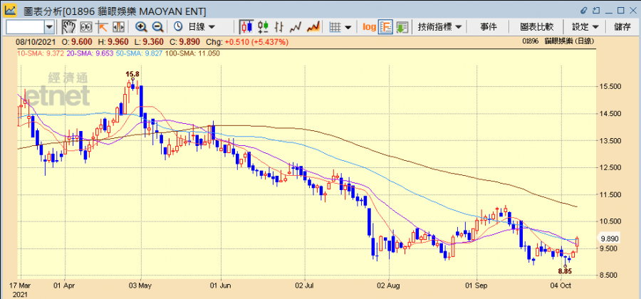 貓眼娛樂雖然受惠於中國電影市道復甦,但今年的股價表現並不理想,除年初表現較佳外,走勢向下居多,現價較2月中的高位19.3元已調整接近50%,低迷的股價或可趁著國慶檔票房報捷而反彈。建議投資者於9.5至9.7元的水平入市,股價短期內或可重上約12元的水平。