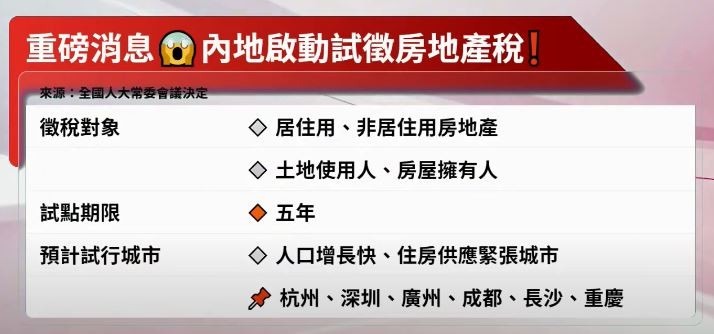 全國人大常委會議在上周六(23日)決定,授權國務院在部分地區展開房地產稅改革試點工作,徵稅對象為居住用和非居住用等各類房地產,不包括依法擁有的農村宅基地及其上住宅,土地使用權人、房屋所有權人為房地產稅納稅人。試點期限為5年,最快或於年底前落實。不過,當局暫時未有公布試點城市及具體稅率。