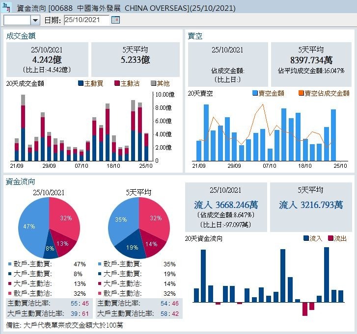 話雖如此,若仔細分析中海外的資金流向,即使其主動買沽比率為55:45,屬及格水平,但大戶(單宗成交金額大於100萬元)主動買沽比率則為39:61,較過往五日的58:42遜色,反映大戶沽貨態度轉趨積極。