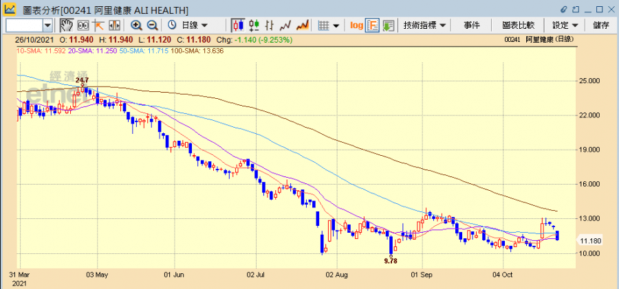 阿里健康發盈警,股價半日跌近一成。(阿里健康網頁截圖)